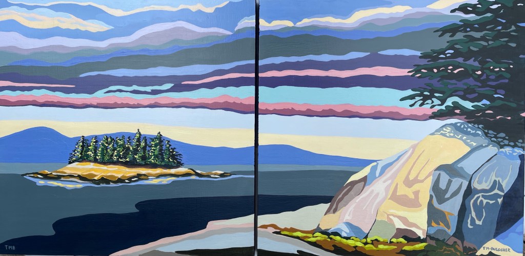 My path to becoming an artist and illustrator has taken many turns. I have always seen myself first as a draftsman, valuing the accurate representation of images and vistas drawn from life and plein aire ventures. After moving to Maine thirty years ago I discovered the excitement of painting in designer gouache. While sometimes tricky to over-paint, I found an ease in creating matte-textured images that began to subtly mirror my earlier design work in serigraphs. In 2001 I was introduced almost accidentally to the acrylic gouaches that anchor my work now. I always start my images from nature, on site, and with a variety of small sketches in colored pencil or watercolor. Coupled with photographs from the scene, I create a larger permanent work in the studio–but as the painting evolves, it inevitably drifts away from the earlier sketches and photos and takes on a character all its own!